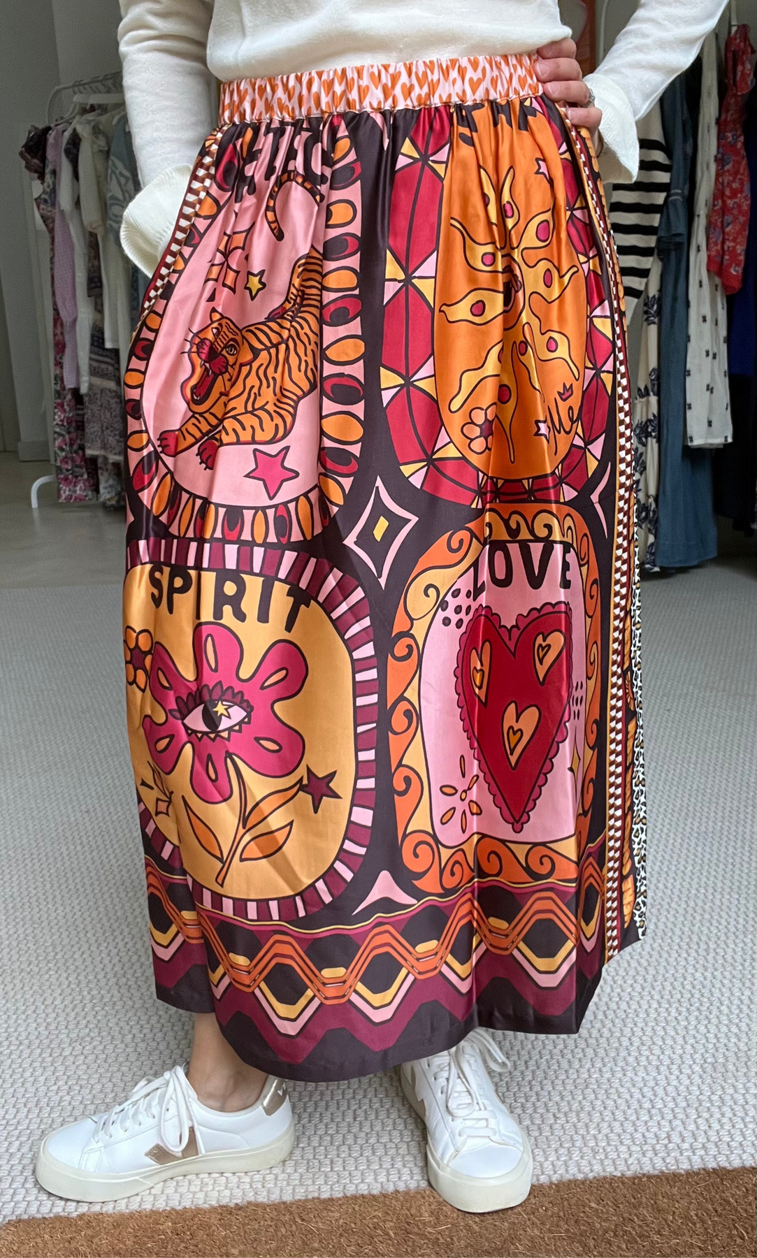A new season midi skirt from me369 the Sunset skirt is here to lift your spirits. The colours are really stunning. Rich oranges, reds and pink mingle with pretty flowers and hearts and the brand's signature tiger. Such an easy to wear style with side pockets and an elasticated waist.