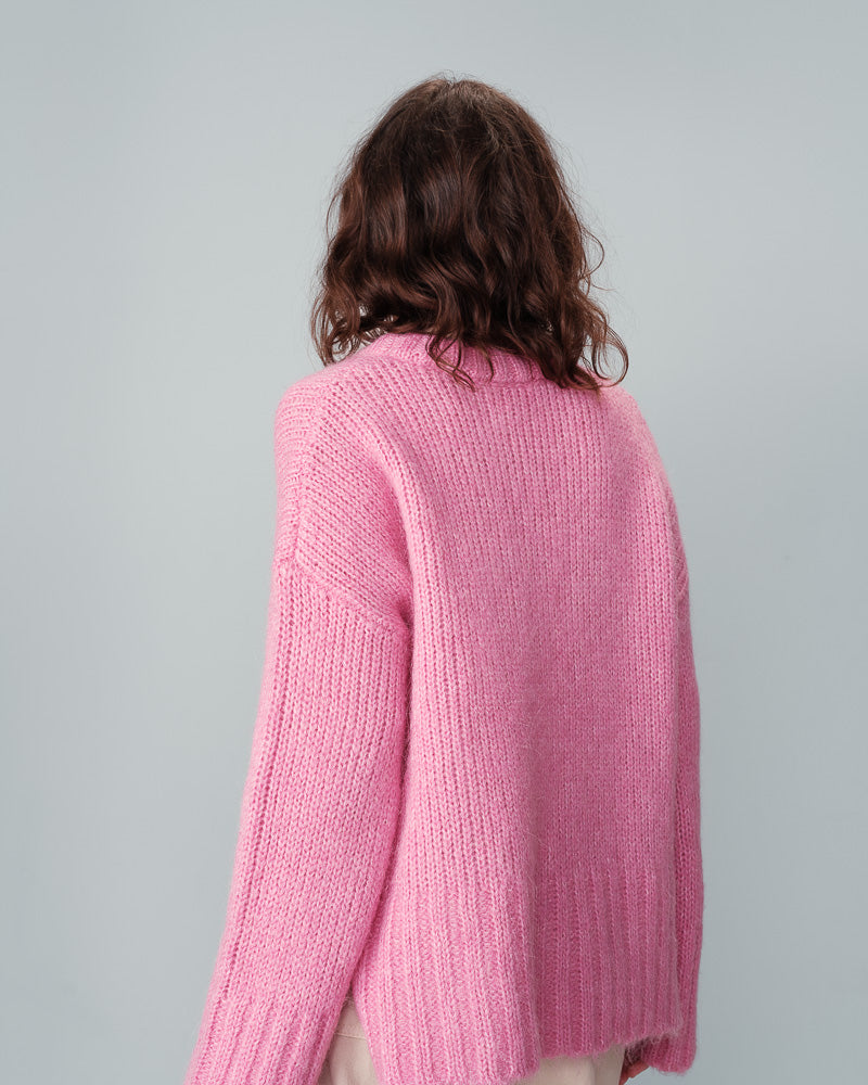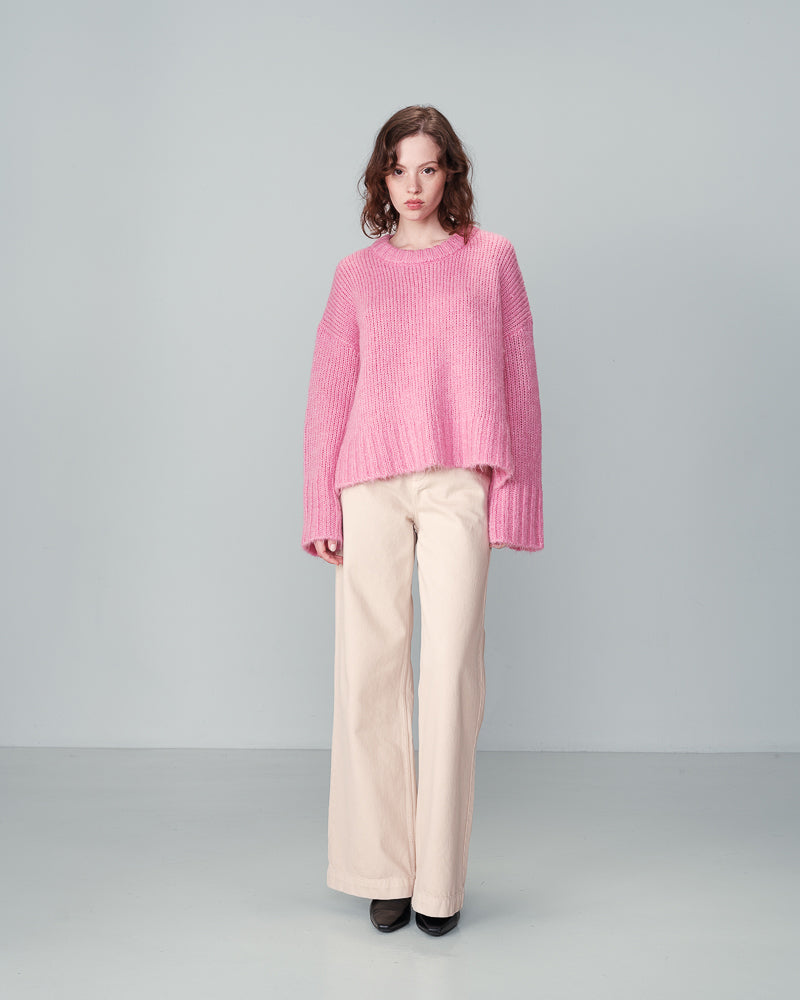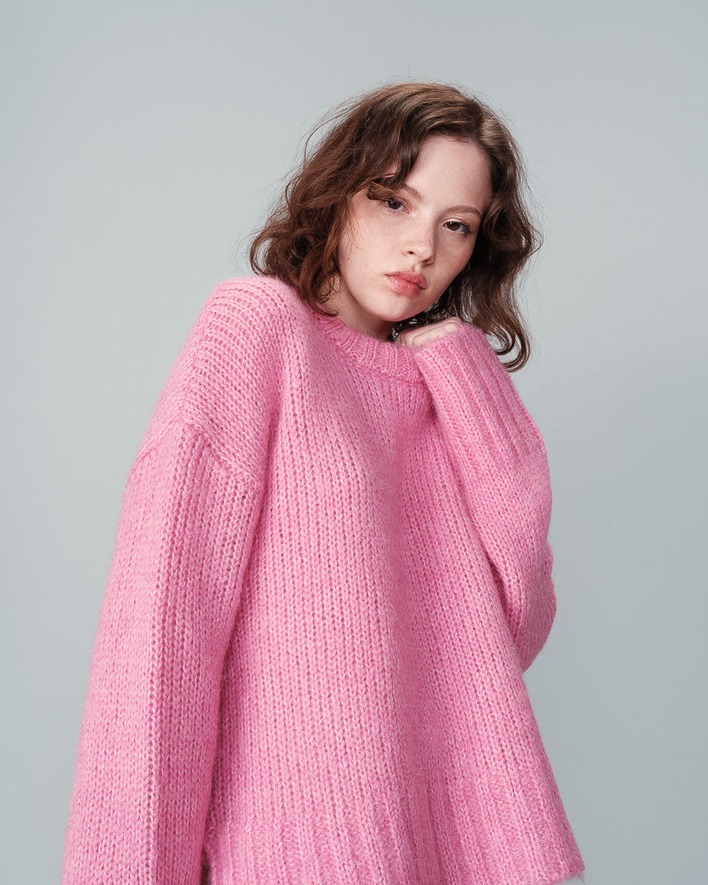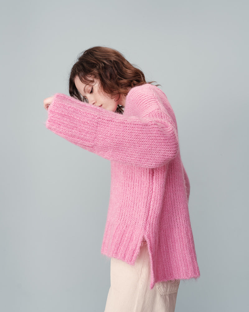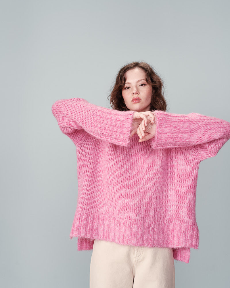 Jumpers don't get any more cosy than these. This new pink knit from Grace & Mila is beautifully soft and perfect to wear for those cold winter days. We love the shape of it, slightly oversized and square with a drop shoulder and wide sleeves. It has a classic round neck and slits on the side. Wear it with cords or a leather skirt for a more chic vibe. The colour is simply delicious.