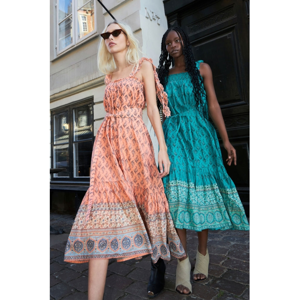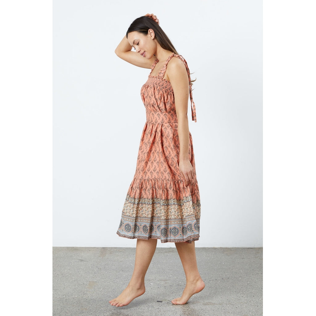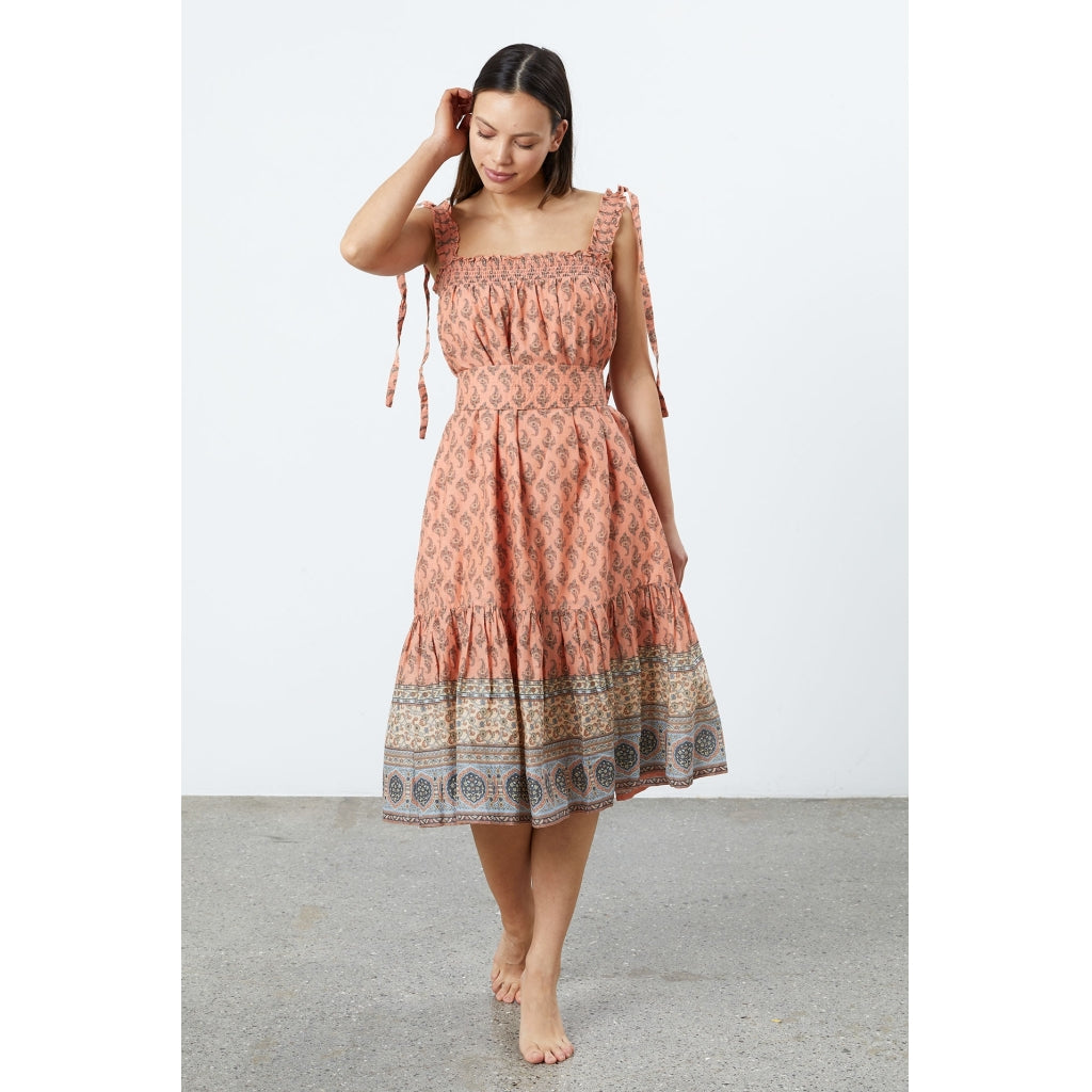 The Tabitha midi dress in Coral is designed by our favourite Danish brand Lollys Laundry. Part of their high Summer collection, this is a classic sundress with a unique Indian inspired botanical print.