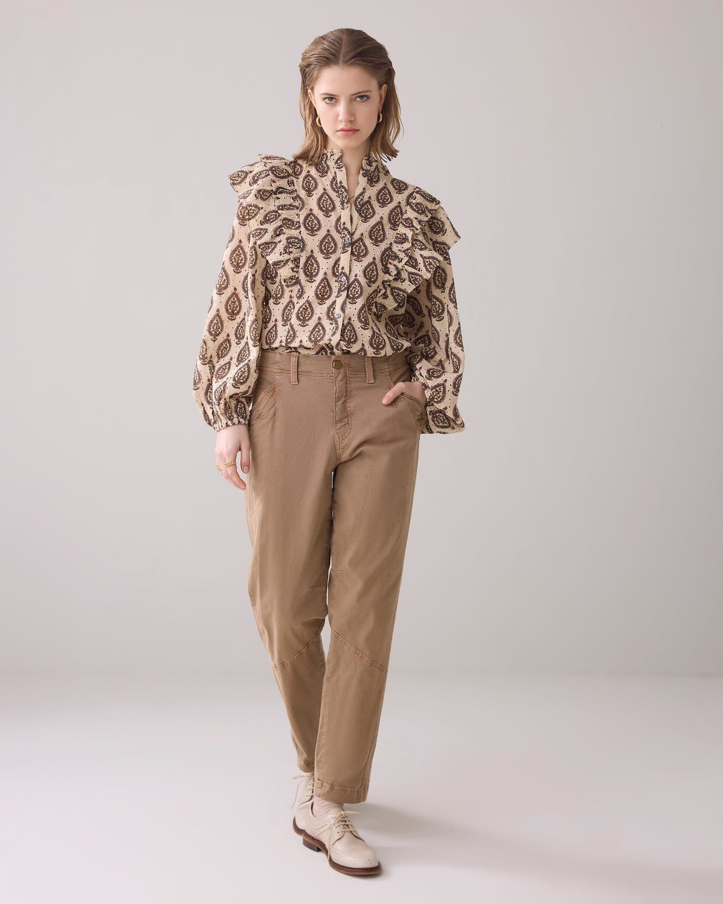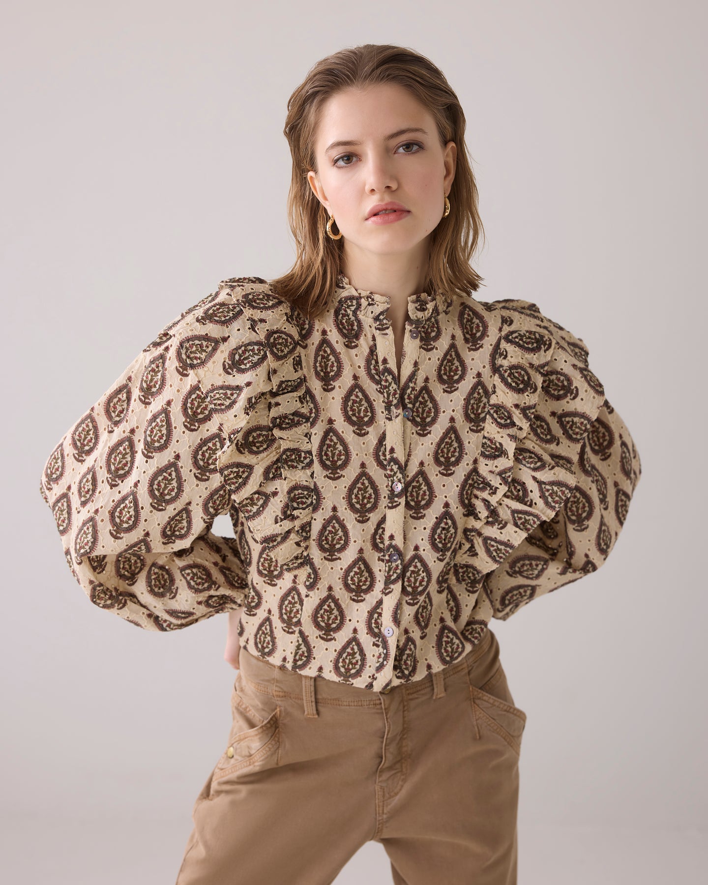 NEW from Summum this romantic Autumn blouse is made 100% cotton Broderie material. The print is beautiful, an orange and brown floral print on a beige background. The balloon sleeves are super elegant and the frills on the shoulder very on trend. This top is shorter than most so you can wear it out or tucked in.